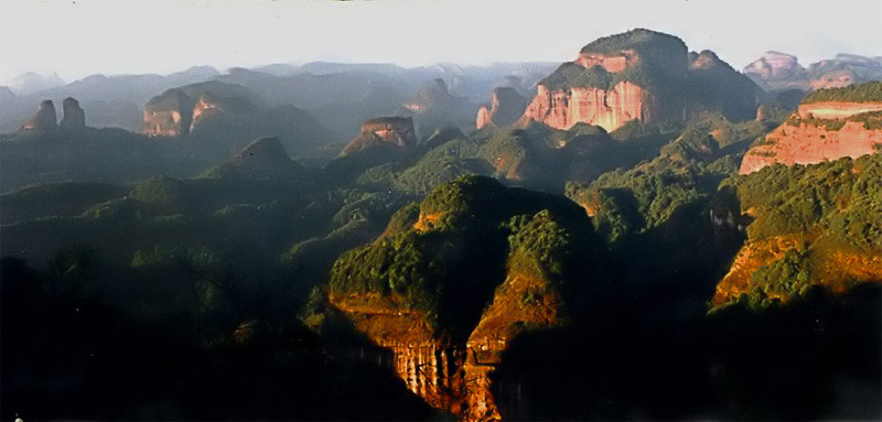丹霞山位于广东仁化县城南8公里处,原名长老寨。向以“奇、险、美”著称,是广东四大名山之一。因山岩由红砂岩构成,“色渥如丹,灿若明霞”,故名丹霞,是观光避暑的胜地。丹霞山山势巍峨,森林茂密,风景优美,气候宜人,梵宫宝殿,引人入胜。